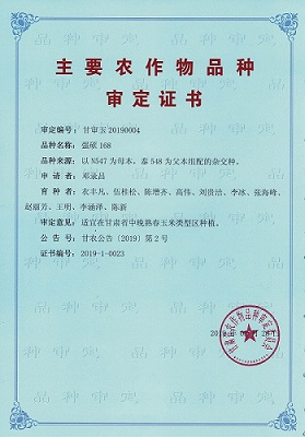 主要農(nóng)作物審定證書(shū)-強(qiáng)碩168(甘肅)