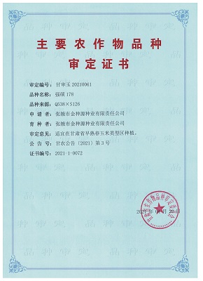 主要農(nóng)作物審定證書(shū)-強(qiáng)碩178(甘肅)