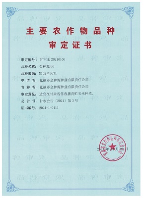 主要農(nóng)作物審定證書(shū)-金種源66(甘肅)